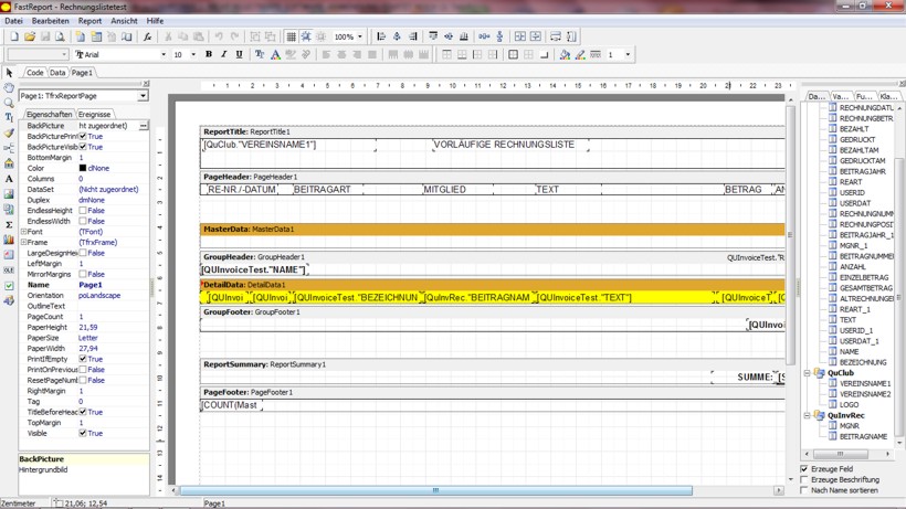 Natürlich können Sie Berichte und Reports nach Ihren eigenen Wünschen verändern. Der integrierte Reportdesigner erlaubt es Ihnen, eigene Felder, Überschriften, Grafiken, etc. in vorhandene Berichte 'einzubauen'. Weiterhin können Sie auf einfache Weise selbst definierte Listen erstellen (z. Bsp. wie oft hat ein Mitglied gespielt) oder aber den Mitgliedsausweis für Ihren Club / Verein individuell gestalten (Stichwort: Sponsorenwerbung).
